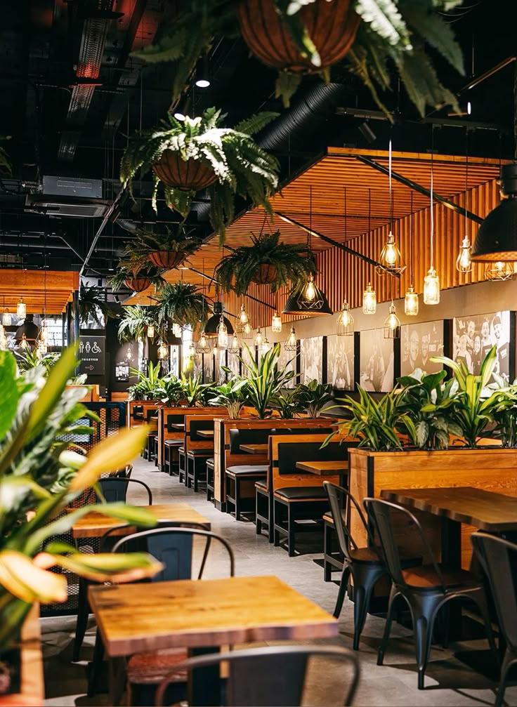 - Cafes: Install living walls and potted plants. Use large windows and wooden furniture to create an airy, nature-inspired oasis.